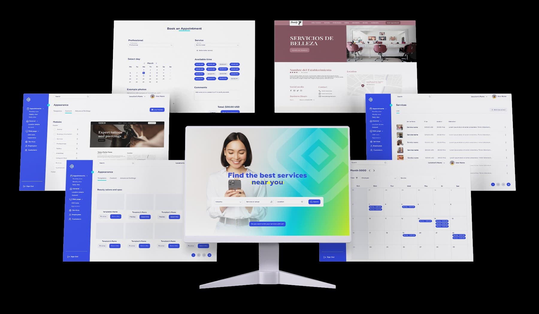 Diseño de interfaz y experiencia de usuario para una aplicación móvil dirigida a estilistas y profesionales de belleza. El concepto de la app permite gestionar citas, organizar agendas y ofrecer a los clientes una forma sencilla de reservar servicios. También incluye una plantilla personalizable para que cada estilista pueda crear su propia página web con sistema de reservas, calendario y catálogo de servicios.